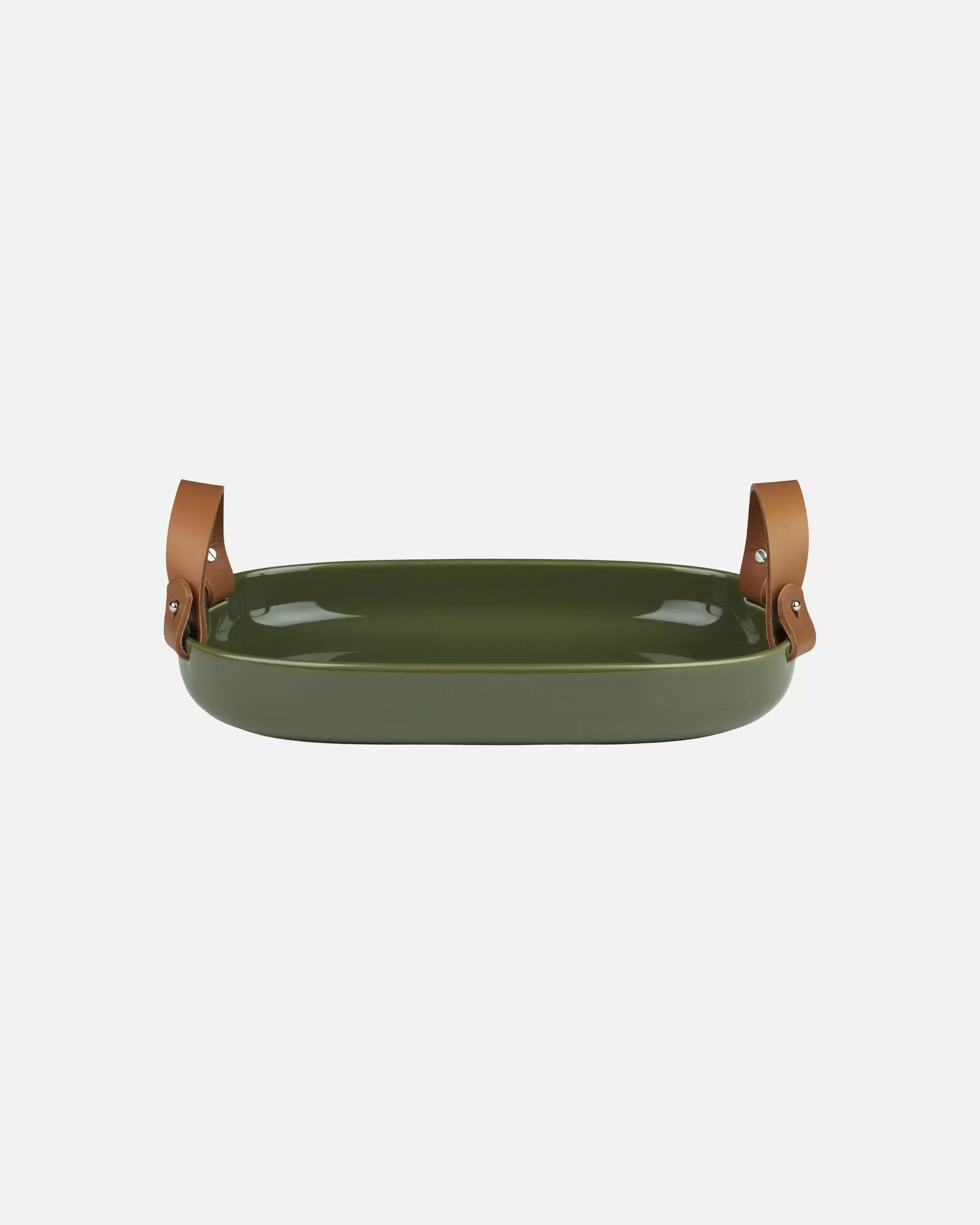 Design: Suuri tarjoiluastia nahkaisilla kantokahvoilla ja vihreällä lasitteella. Oiva-sarjan muotoilija: Sami Ruotsalainen.
