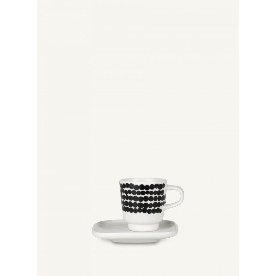 Mustavalkoinen espressokuppi, jota koristaa Räsymatto-kuosi. Suloinen kuppi myydään yhdessä pikkulautasen kanssa. Kuvio kohdistettu.