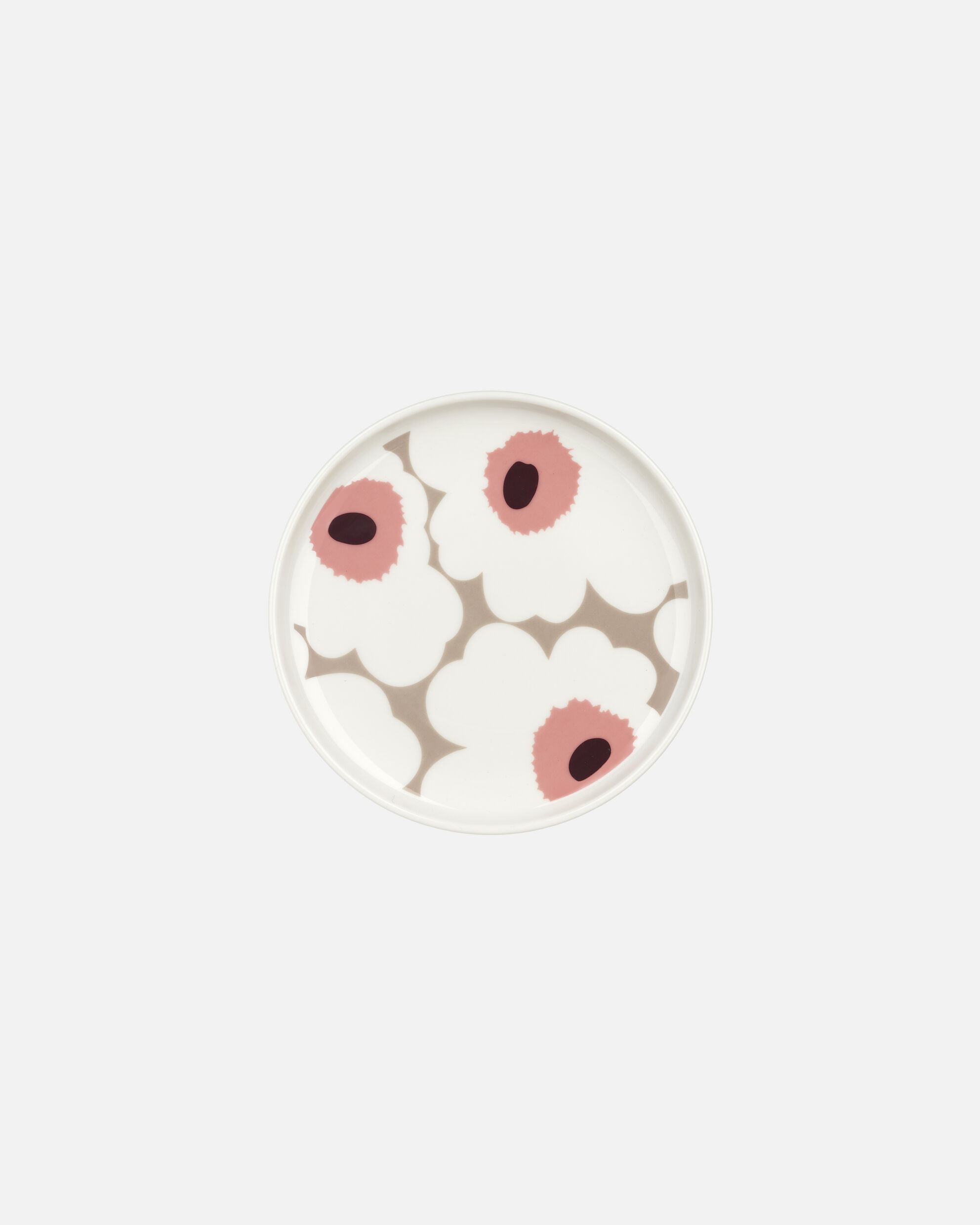 Pienessä Oiva lautasessa on valkoisen ja beigen sävyinen Unikko kuosi. Lautanen on valmistettu konepesun, uunin, mikroaaltouunin ja pakastuksen kestävästä valkoisesta keramiikasta.