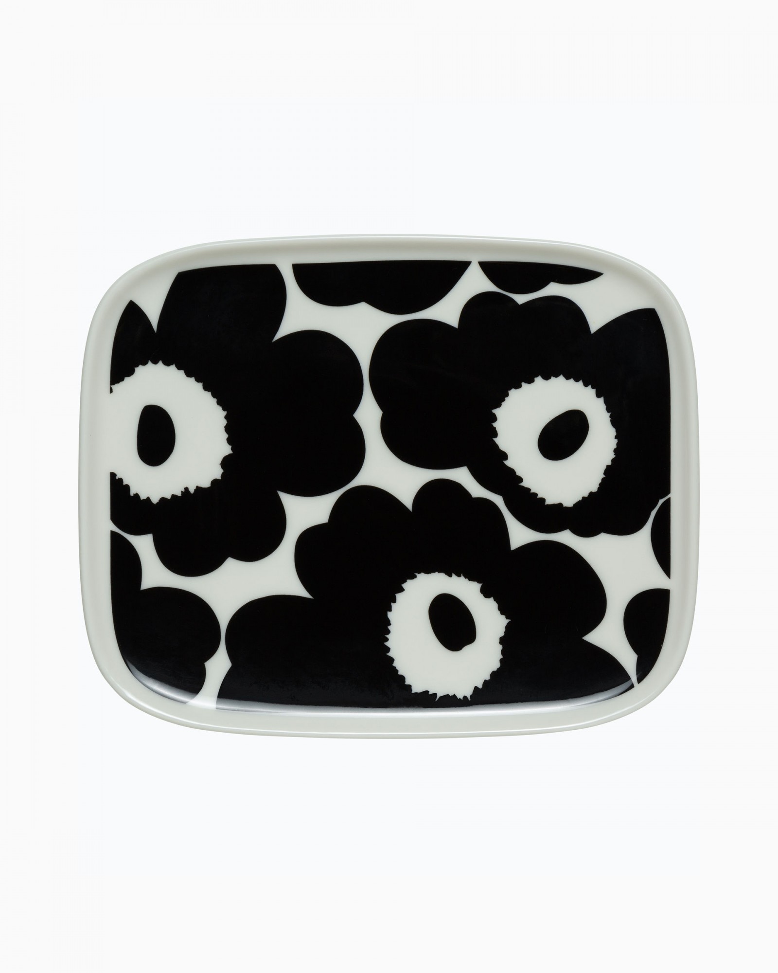 Kätevässä suorakulmaisessa Oiva lautasessa on kaunis mustavalkoinen Unikko kuosi. Lautanen sopii moneen käyttöön, voileipälautaseksi, juhlapäytään kakkulautaseksi tai vaikka kynttilän alle suojaksi. Se on valmistettu konepesun, uunin, mikroaaltouunin ja pakastuksen kestävästä valkoisesta keramiikasta.