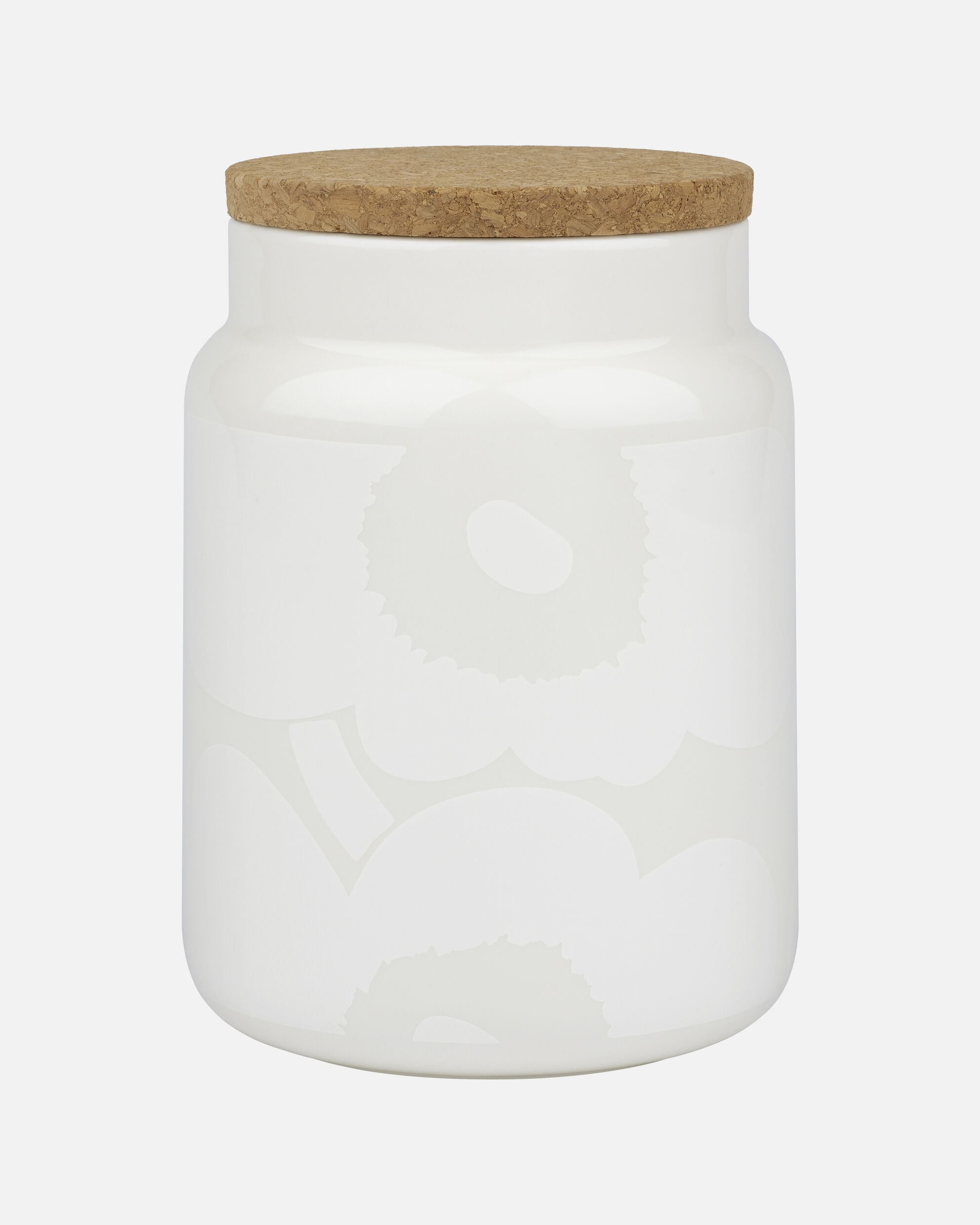 Valkoisella Unikko-kuosilla painettu säilytyspurkki on valmistettu valkoisesta keramiikasta. Purkissa on korkkikansi, jossa on Marimekko-logo sisäpuolella. Suosittelemme kannelle käsinpesua.