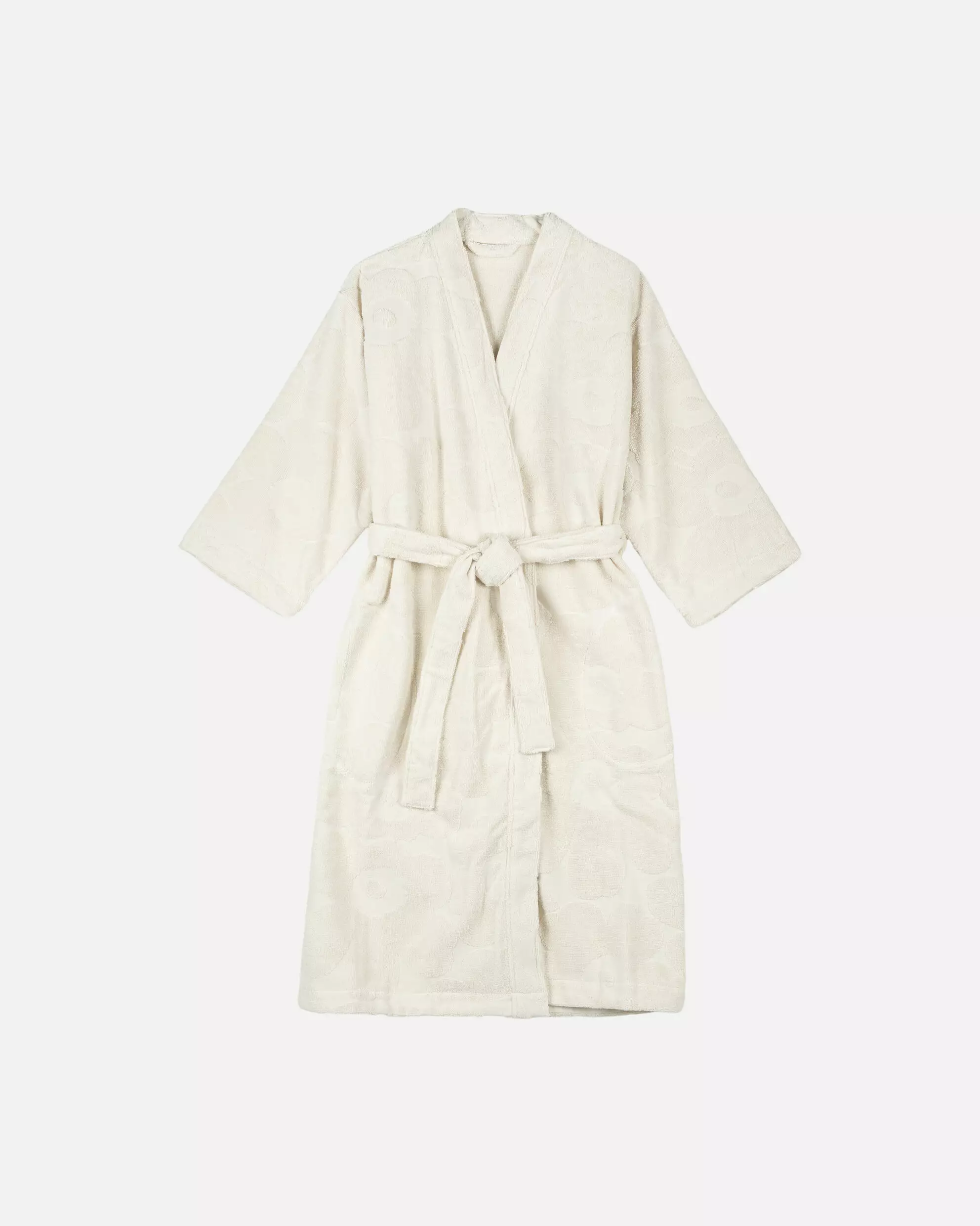 Luomupuuvillafroteesta valmistetussa kylpytakissa on Pieni Unikko -kuosi. Kylpytakissa on suuret taskut edessä ja irrotettava vyö.