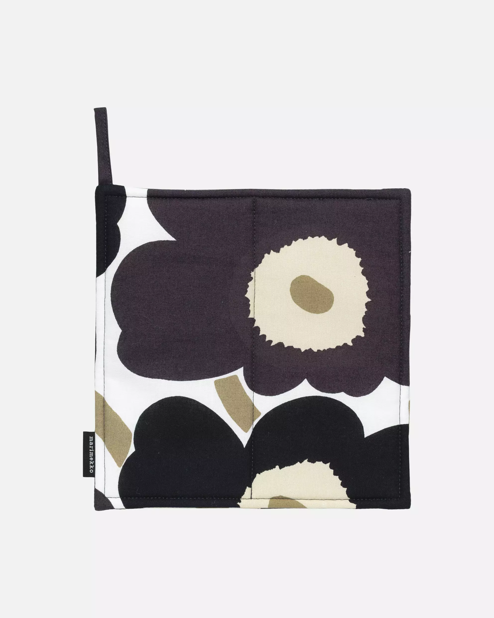 Tuote: Marimekko Pieni Unikko Pannulappu Avainsanat: Marimekko Pieni Unikko pannulappu, luomupuuvilla, kierrätyspehmuste, keittiötekstiilit, valkoinen tummanharmaa beige, Maija Isola.