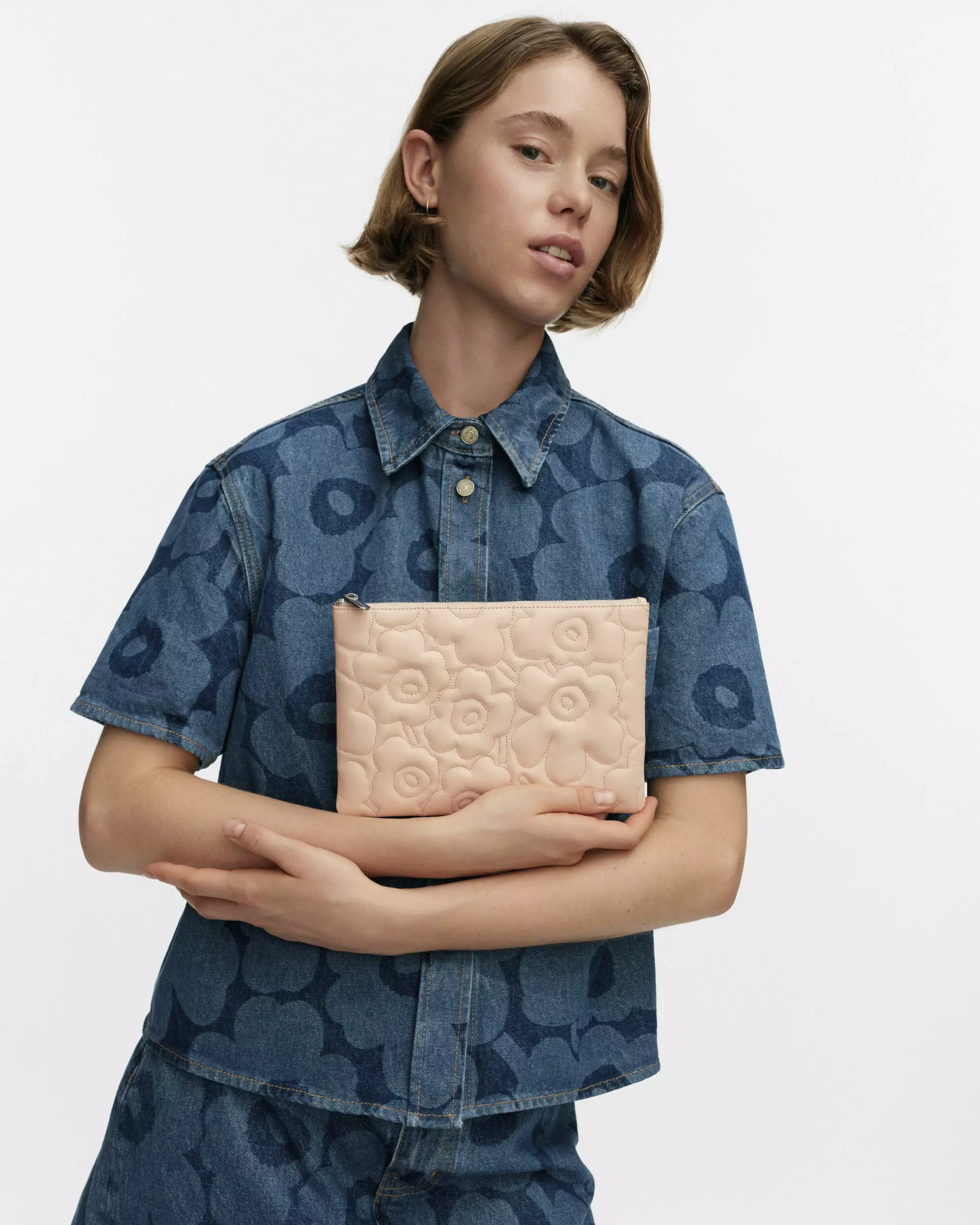 Marimekko Pouch Bag on moderni ja hienostunut käsilaukku, jossa yhdistyvät ikoninen muotoilu ja ylellinen tuntu. Tämä vaaleanpunainen laukku on valmistettu pehmeästä nahasta, johon on tikattu Maija Isolan rakastettu Unikko-kuosi. Tikattu pinta antaa laukulle trendikkään, pehmustetun ilmeen ja tekee siitä asun kuin asun katseenvangitsijan.