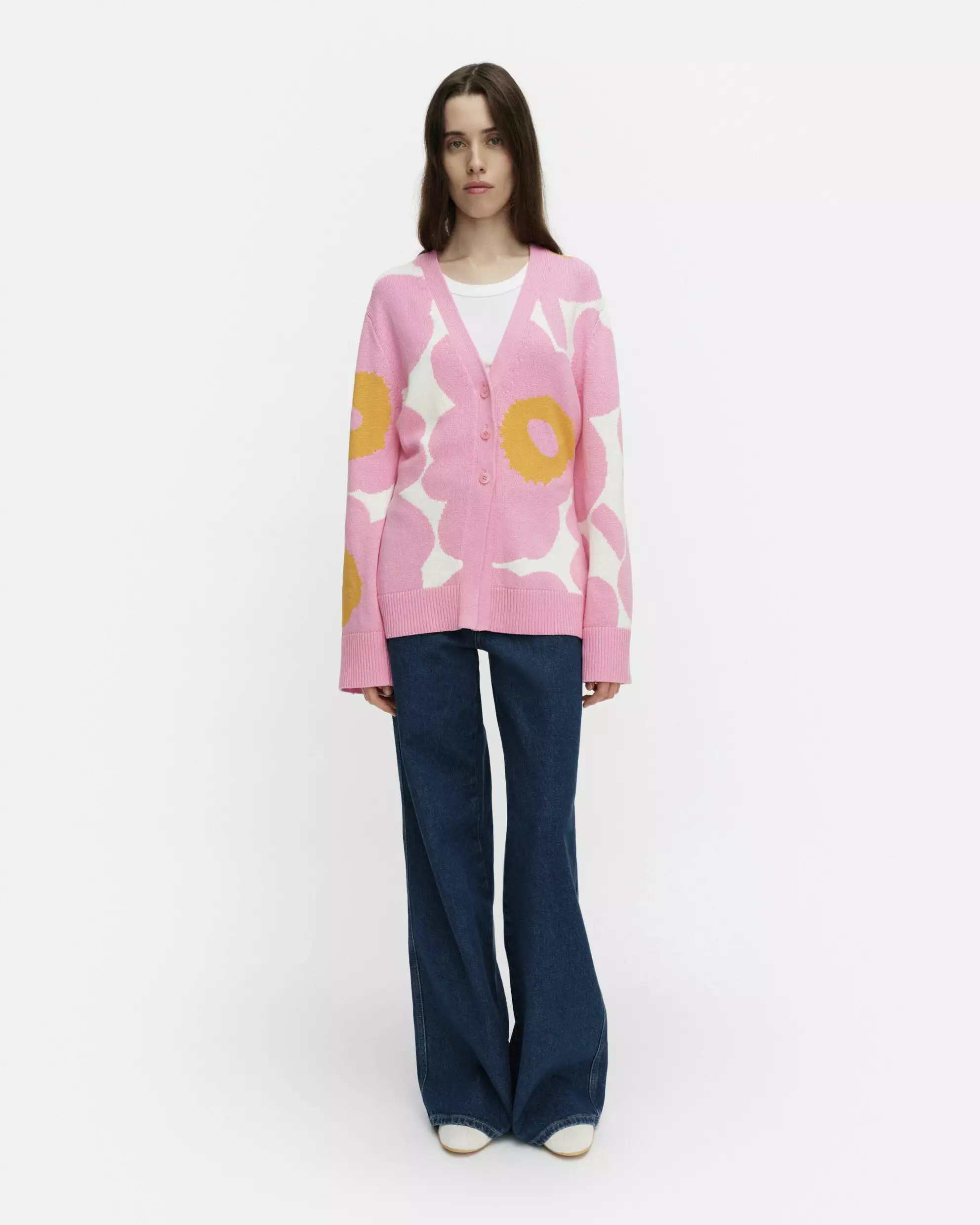 Marimekko Puhaltaa on neulemuotoilun taidonnäyte, jossa yhdistyvät pehmeä luomupuuvilla ja ikoninen Unikko-kuosi. Neuletakki on valmistettu perinteisellä intarsiamenetelmällä, mikä antaa kuviolle selkeyttä ja neulokselle ylellisen eläväisen pinnan. Raikkaan vaaleanpunaisen, oranssin ja valkoisen sävyt tuovat asuun ripauksen energiaa ja aurinkoista tyyliä, tehden tästä neuleesta jokaisen asun keskipisteen.