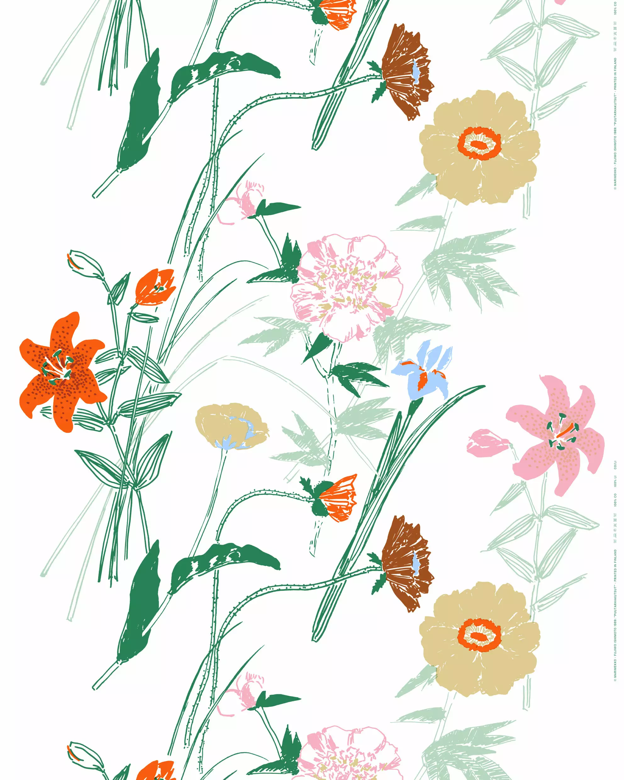 Marimekko Puutarhakutsut Puuvillakangas, valkoinen, vihreä, oranssi, beige