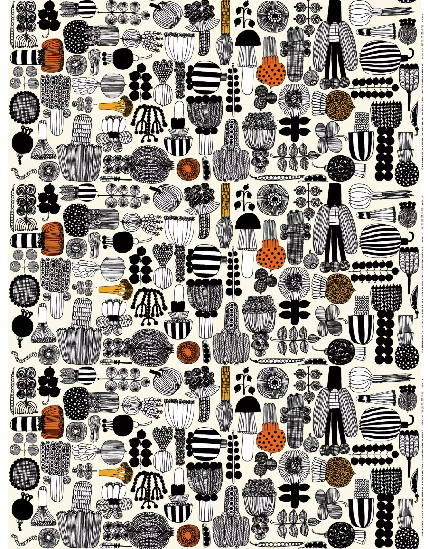 Marimekko Puutarhurin Parhaat Akryylipinnoitettu Puuvillakangas, valkoinen, musta, oranssi