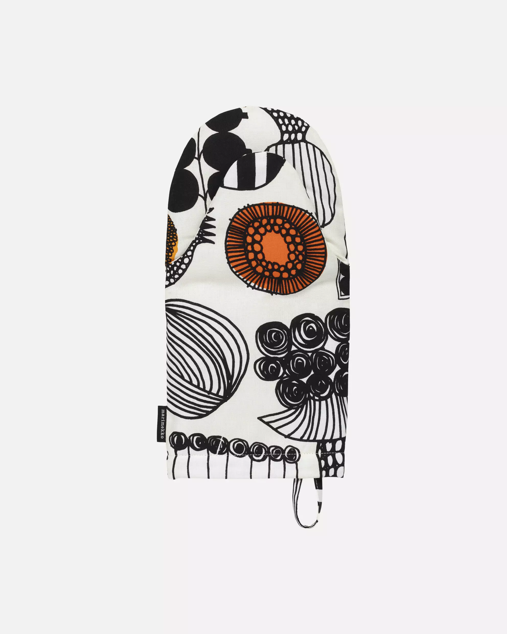 Tuo iloa ja väriä keittiöön tällä Marimekko Puutarhurin Parhaat -uuninkintaalla. Puuvillakankaasta valmistetussa kintaassa on Maija Louekarin leikkisä viivapiirroskuosi. Uunikintaassa on tarvittava toppaus suojaamaan käsiäsi ja kätevä lenkki ripustamista varten. Tämä tuote on myös vastuullinen valinta, sillä se sisältää 25 % luomupuuvillaa ja 25 % kierrätettyä puuvillaa, ja sen toppauksesta 50 % on kierrätettyä polyesteria.