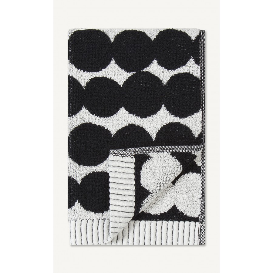 Tätä pehmeää, puuvillasta valmistettua vieraspyyhettä koristaa Räsymatto kuosi.
