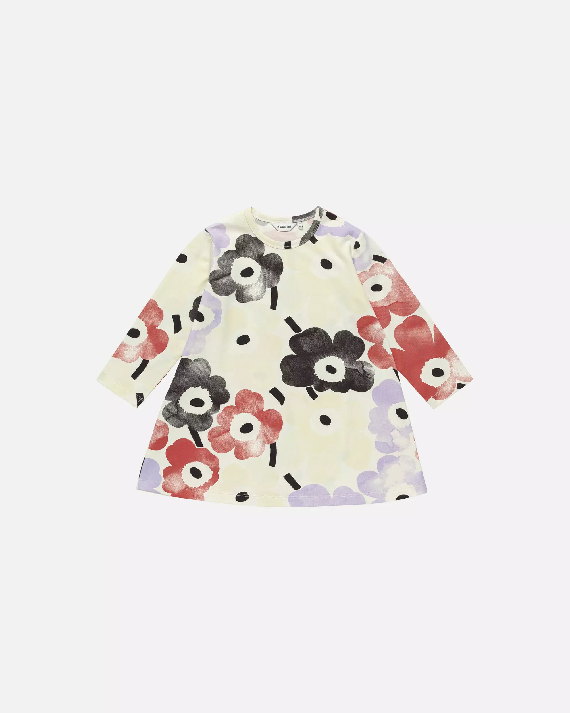 - Design: Lasten pitkähihainen mekko rennolla istuvuudella ja A-linjaisella leikkauksella. Pyöreä pääntie resorikantilla. Unikko-kuosi.