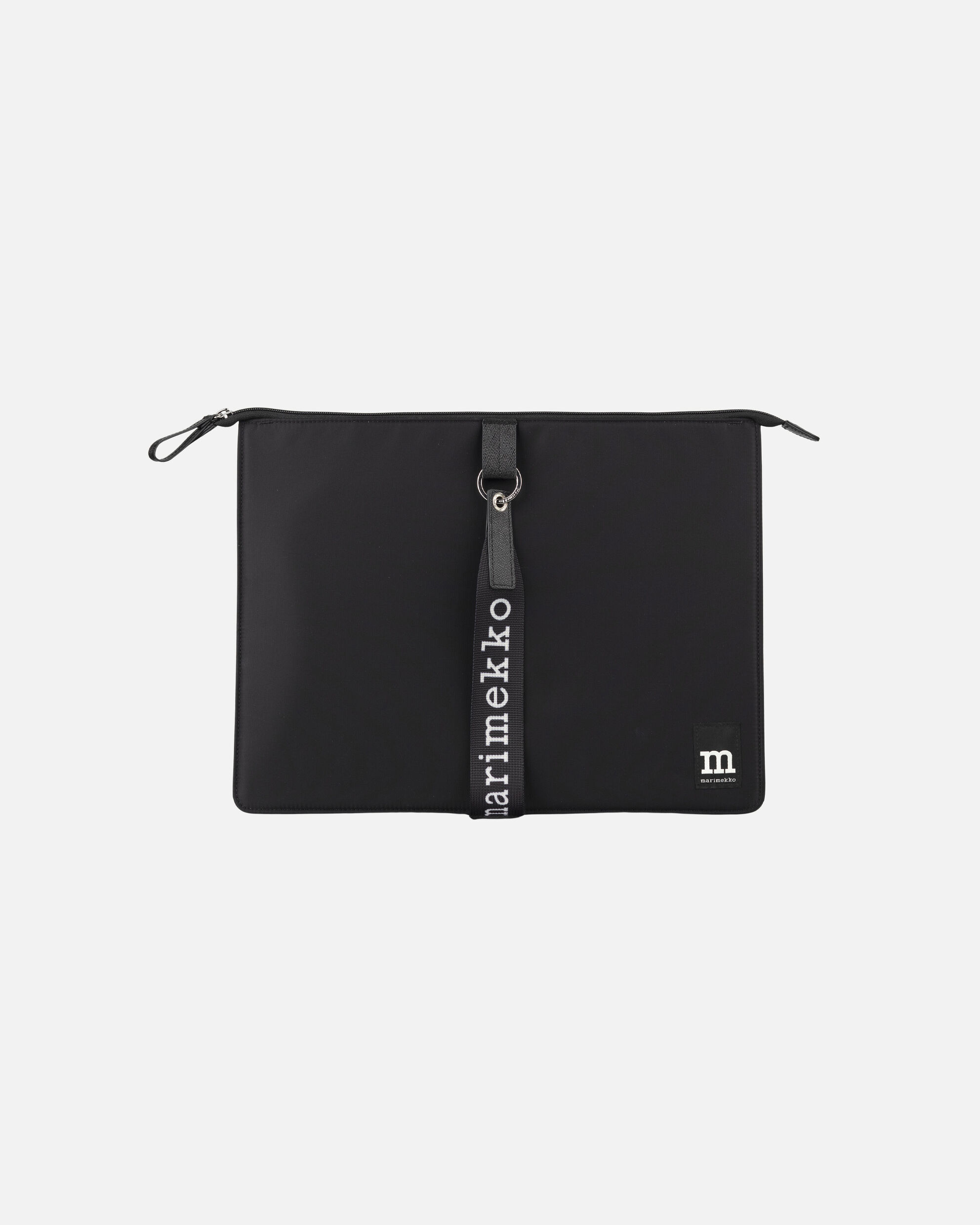 Sleeve 15” -suojatasku on valmistettu kierrätetystä polyamidista. Pehmustettuun suojataskuun mahtuu 15-tuumainen kannettava tietokone. Suojataskussa on vetoketjusuljenta, yksi avoin sisätasku ja Marimekko-tuotemerkkilappu etupuolella. Tuotteessa on nahkaisia yksityiskohtia.