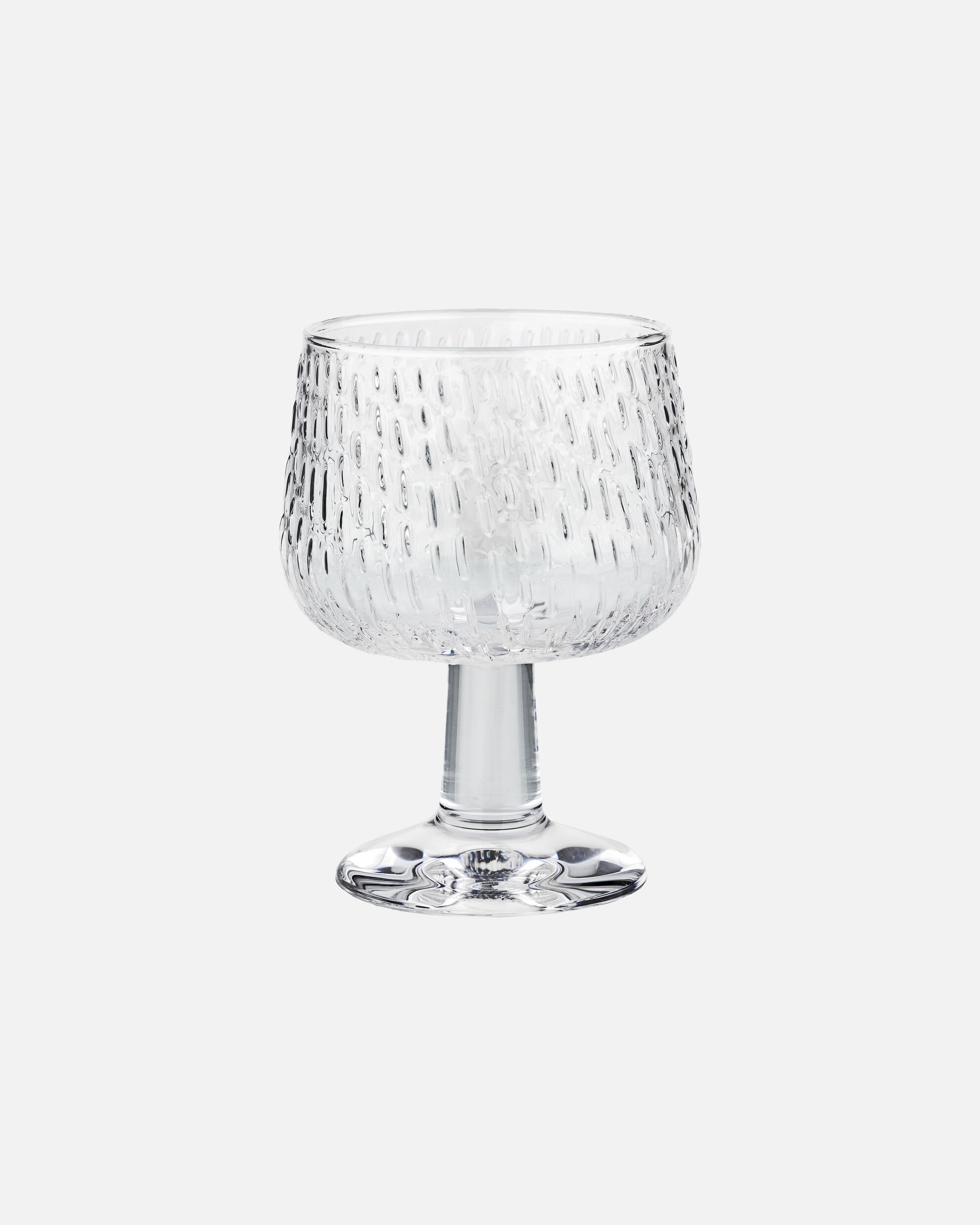 Syksy-jalallinen lasi on valmistettu suupuhalletusta lasista ja siinä on reliefimäinen kuvio. Tuote pakataan Marimekon Logo-kuosiseen laatikkoon.