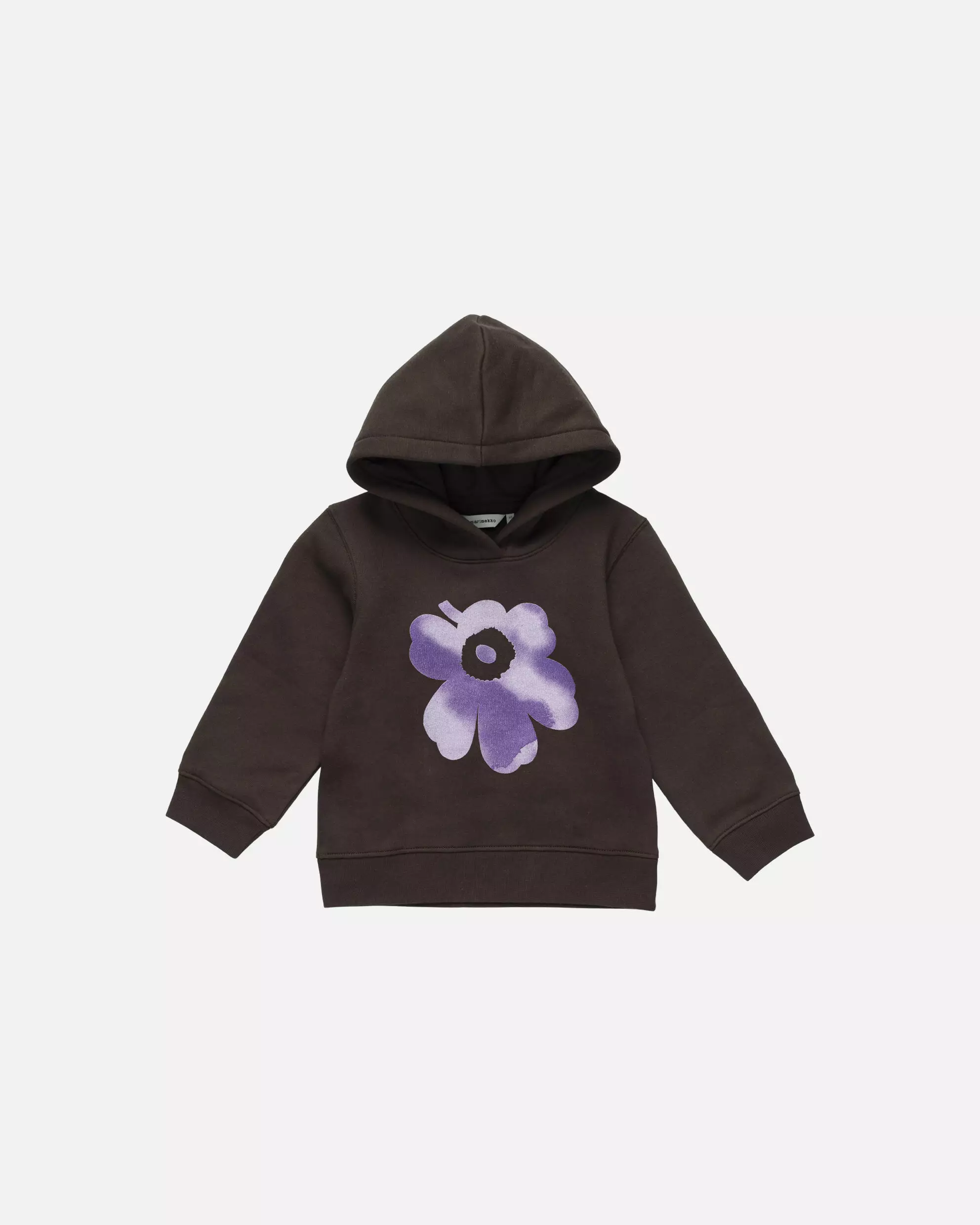 Anna lapsesi pukeutua leikkisästi ja mukavasti tähän Marimekon Tavaton Akvarelli Unikko -huppariin! Tämä lasten huppari on valmistettu pehmeästä collegemateriaalista (80 % puuvillaa, 20 % polyesteriä) ja siinä on rento istuvuus. Hupparin etupuolelle on painettu suuri Akvarelli Unikko -kukka, joka näyttää ikään kuin vesiväreillä maalatulta, luoden taiteellisen ja eloisan ilmeen tummanruskean ja liilan sävyissä. Hihansuissa ja helmassa on leveät resorit. Huppari on vastuullinen valinta, sillä se sisältää 80 % luomupuuvillaa. Unikko-kuosi, luovuuden ja rohkeuden symboli, on Maija Isolan vuonna 1964 luoma rakastettu klassikko.