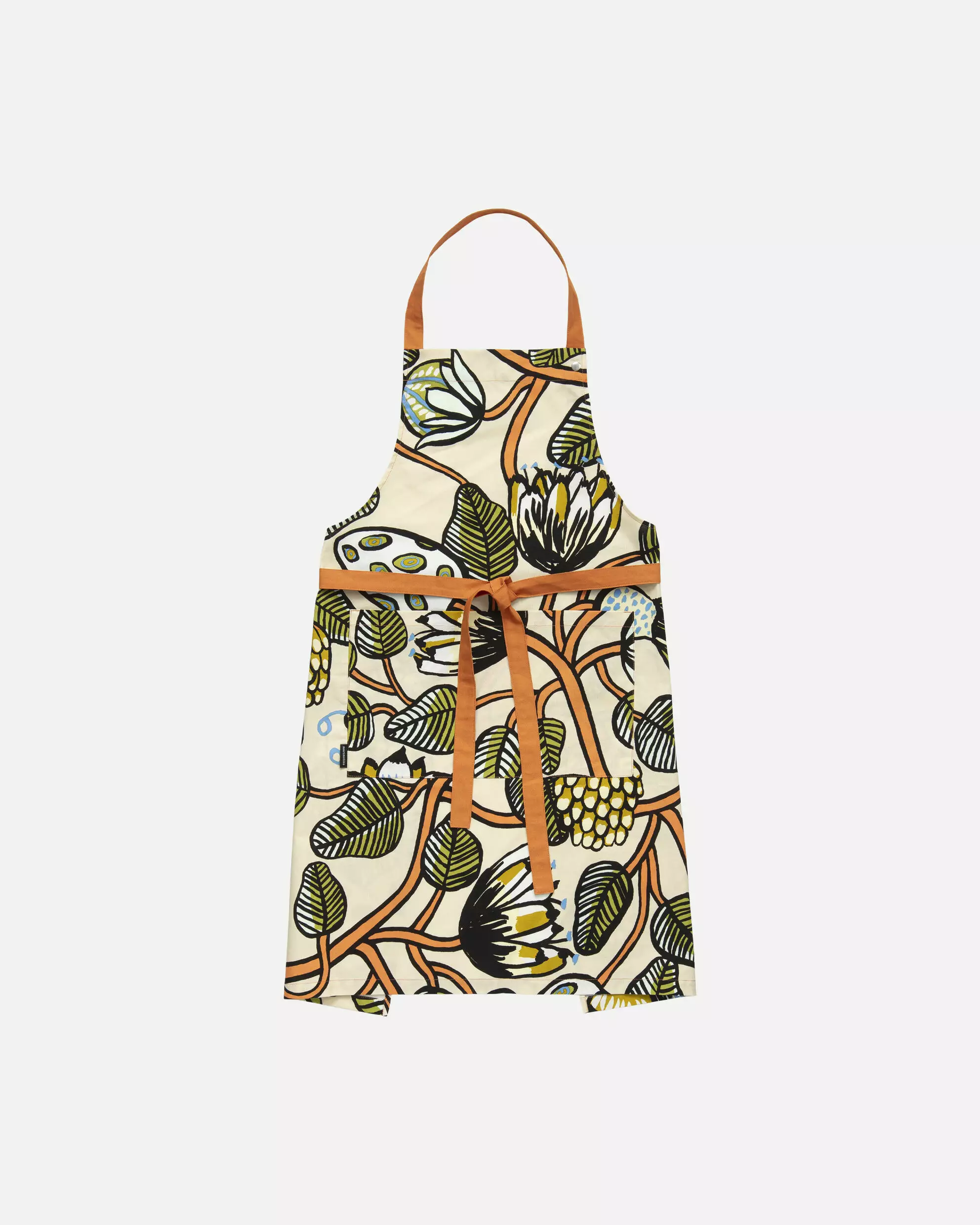 #marimekko #tiara #esiliina #apron #luomupuuvilla #hiekka #lämminoranssi #vihreä #erjahirvi #suomalainendesign #helsinki #viro #kestävä #vastuullinen #ekologinen #keittiövälineet #keittiötekstiilit #lahjaidea #kukkakuosi #etutasku #säädettävä