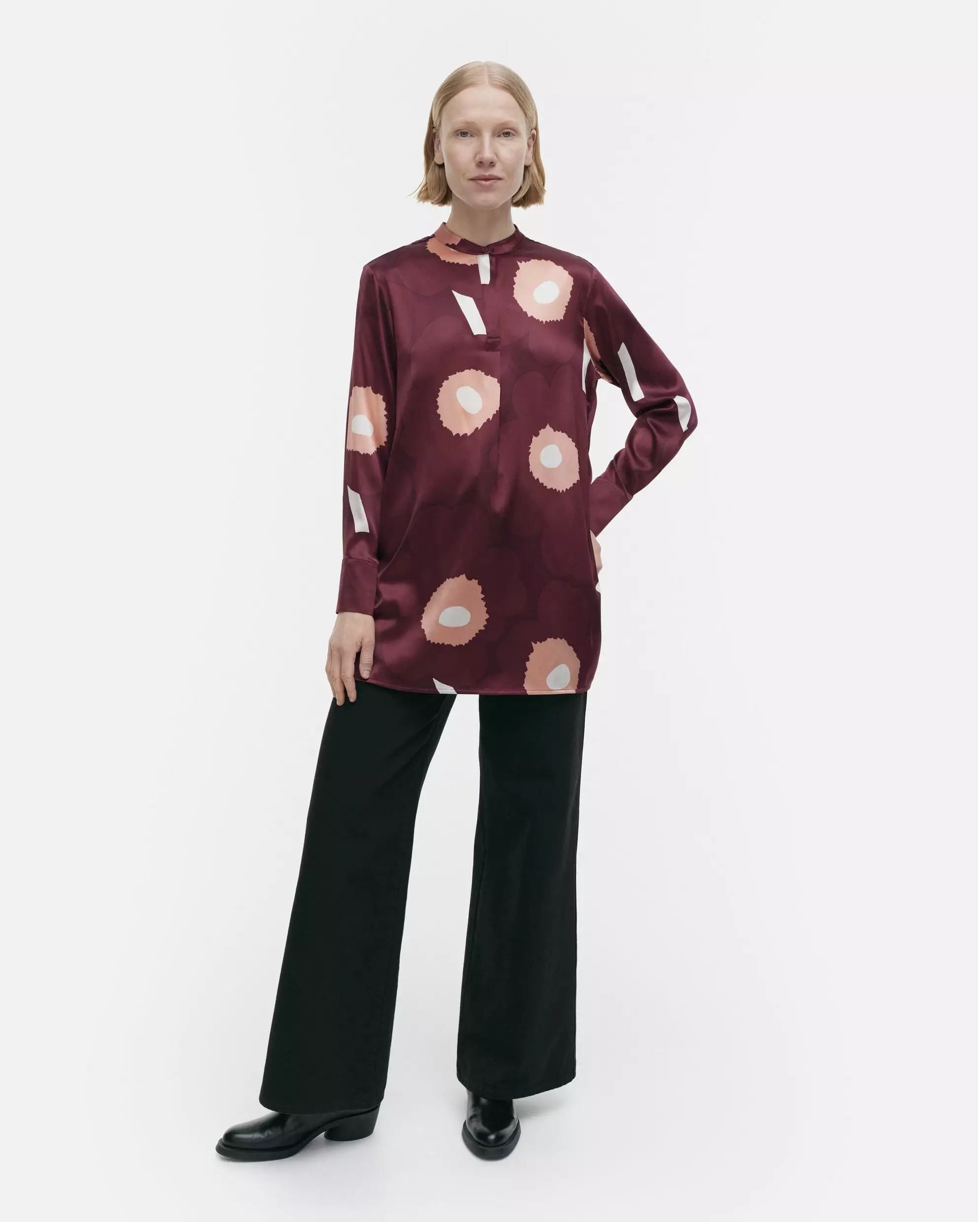 Tiina-tunika on valmistettu silkistä ja siinä on niukka istuvuus, A-linjainen leikkaus sekä Unikko-kuosi. Tuote sisältää 5 % elastaania. Tunikassa on pieni pystykaulus ja edessä lyhyt piilonappilista, jonka alta aukeaa myötälaskos helmaan. Paidassa on selkäkaarroke sekä laskokset takana, napitettavat mansetit hihansuissa ja sivuhalkiot helmassa.