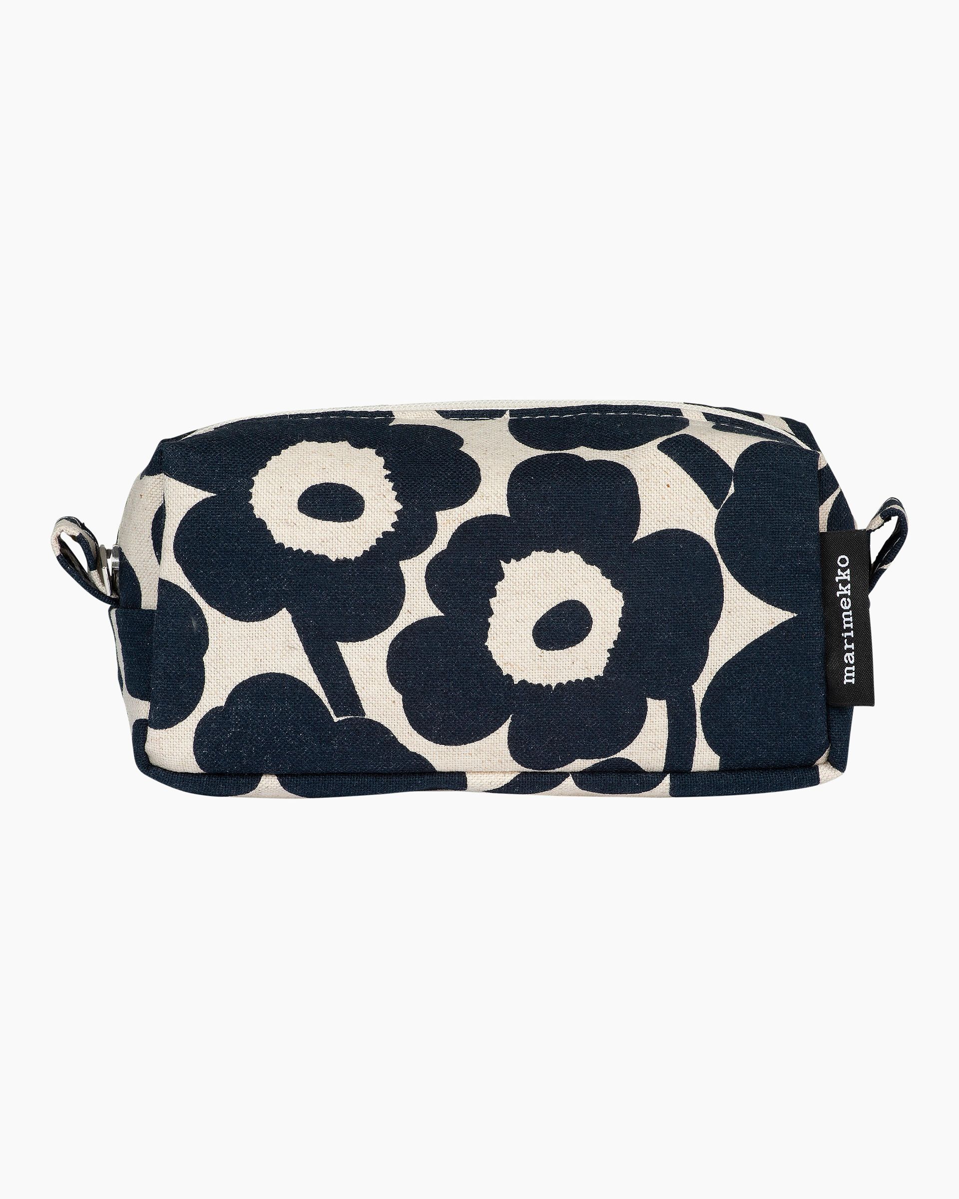 Pieni ja näppärän kokoinen kosmetiikkalaukku. Tähän saat hyvin sopimaan lyhyemmänreissun tarvikkeet tai pienemmät meikkausvälineet. Tiise meikkilaukku on valmistettu valkaisemattomasta puuvillapellavasta, jossa on lianhylkivyyskäsittely ulkopuolella. Laukussa on vetoketjusuljenta ja sisällä nailonvuori. Tummansininen Mini Unikko kuosi on painettu Helsingissä.