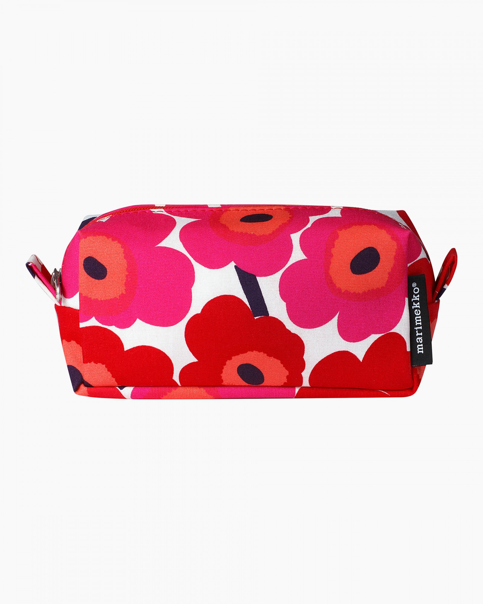 Paksusta puuvillasta valmistetussa Tiise kosmetiikkalaukussa on punavalkoinen Mini Unikko kuosi.