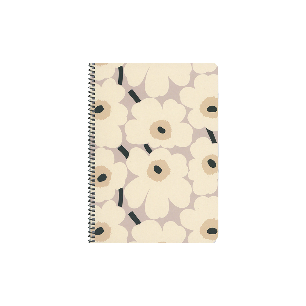 Marimekon Unikko A5 kokoinen kierrevihko. Vihossa on viivalliset sivut ja siinä on 40 lehteä.
