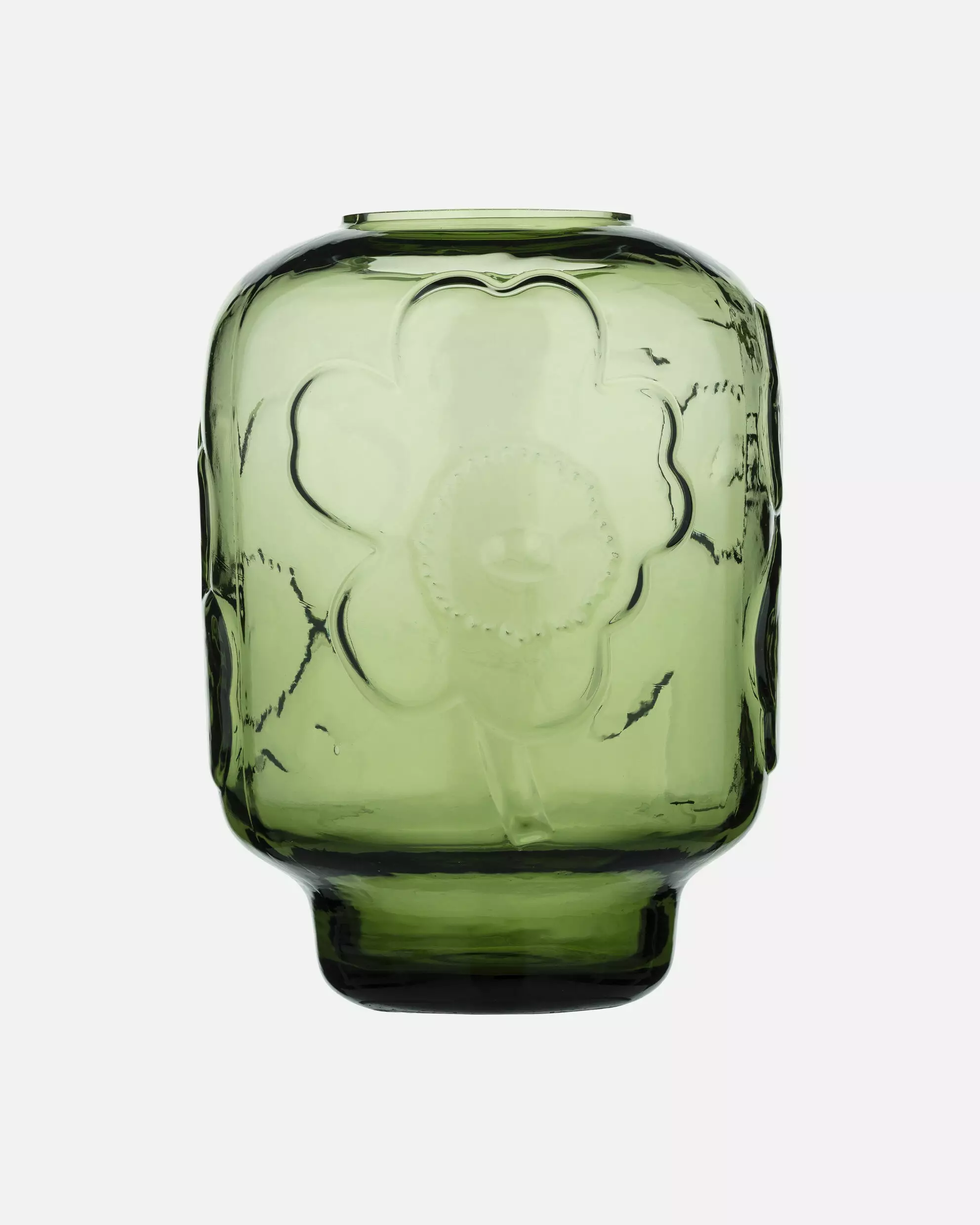 Marimekko Unikko -maljakko hurmaa nyt syvän ja hienostuneen oliivinvihreän sävyisenä. Tämä maljakko on enemmän kuin pelkkä käyttöesine; se on upea lasitaideteos, jossa ikoninen Unikko-kuvio toistuu eleganttina kohokuviona. Oliivin sävy tuo sisustukseen maanläheistä rauhaa ja korostaa lasin eläväistä pintaa, joka taittaa valoa kauniisti ja tuo kukkien luonnollisen kauneuden upeasti esiin.