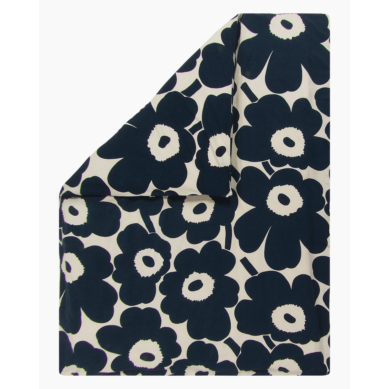 Pehmeästä puuvillapellavasta valmistetussa tuplapussilakanassa on puuvillan ja tummansinisen sävyinen Unikko-kuosi.