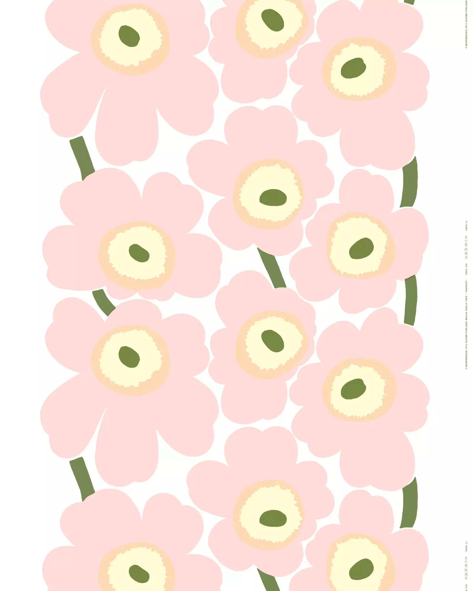 Unikko syntyi vuonna 1964 vastalauseena kukattomuudelle, ja siitä on muodostunut yksi maailman tunnetuimmista kukkakuoseista. Tässä versiossa pehmeän pastelliset sävyt – vaaleanpunainen, keltainen ja vihreä – yhdistyvät puhtaaseen luonnonvalkoiseen pohjaan, luoden raikkaan ja aurinkoisen tunnelman tilaan kuin tilaan.
