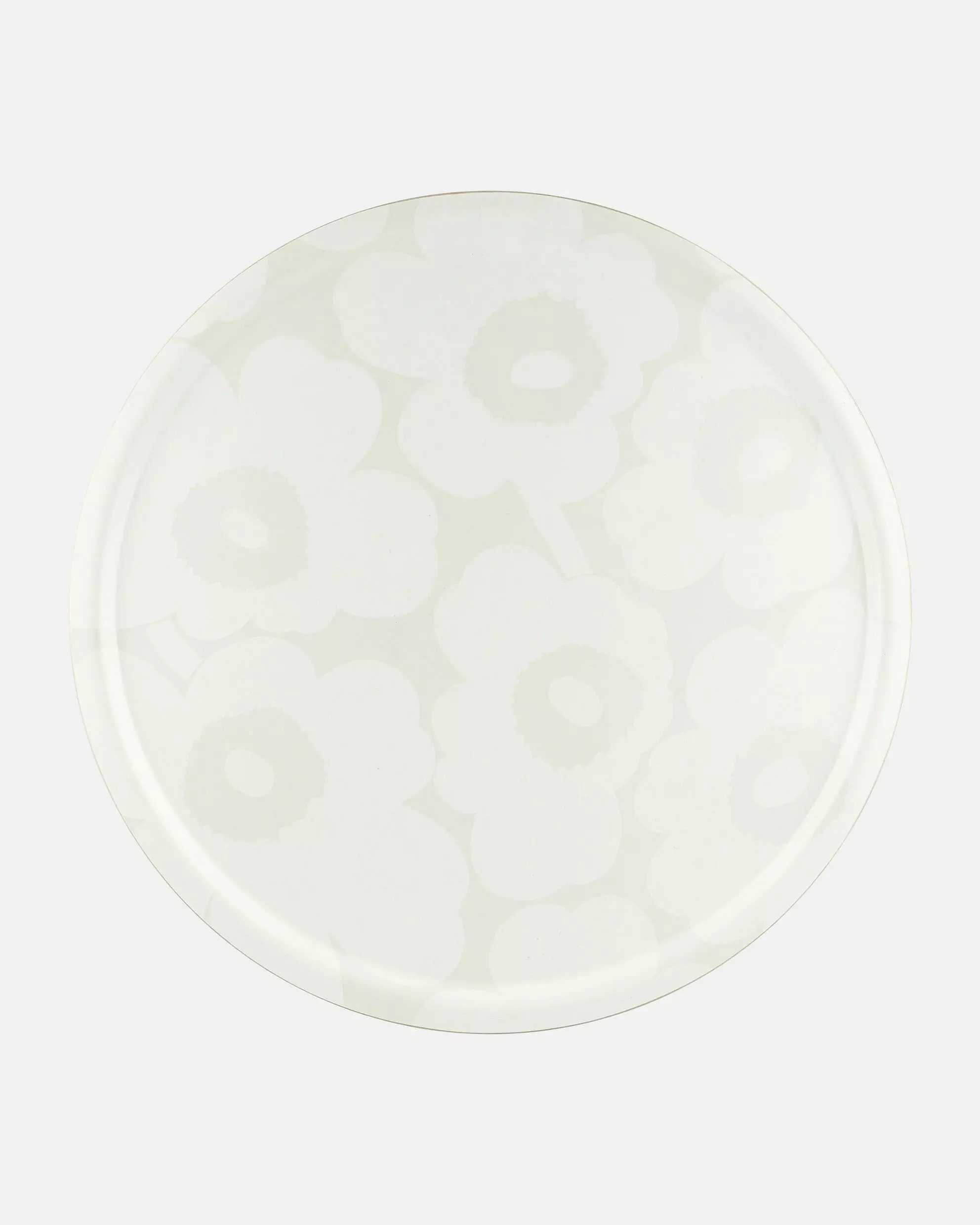 Tämä Marimekko Unikko -tarjotin on valmistettu pyöreästä poppelivanerista ja siinä on ikoninen valkoinen Unikko-kuosi. Tarjotin on sekä kaunis että käytännöllinen, ja se sopii täydellisesti tarjoiluun tai sisustuselementiksi.
