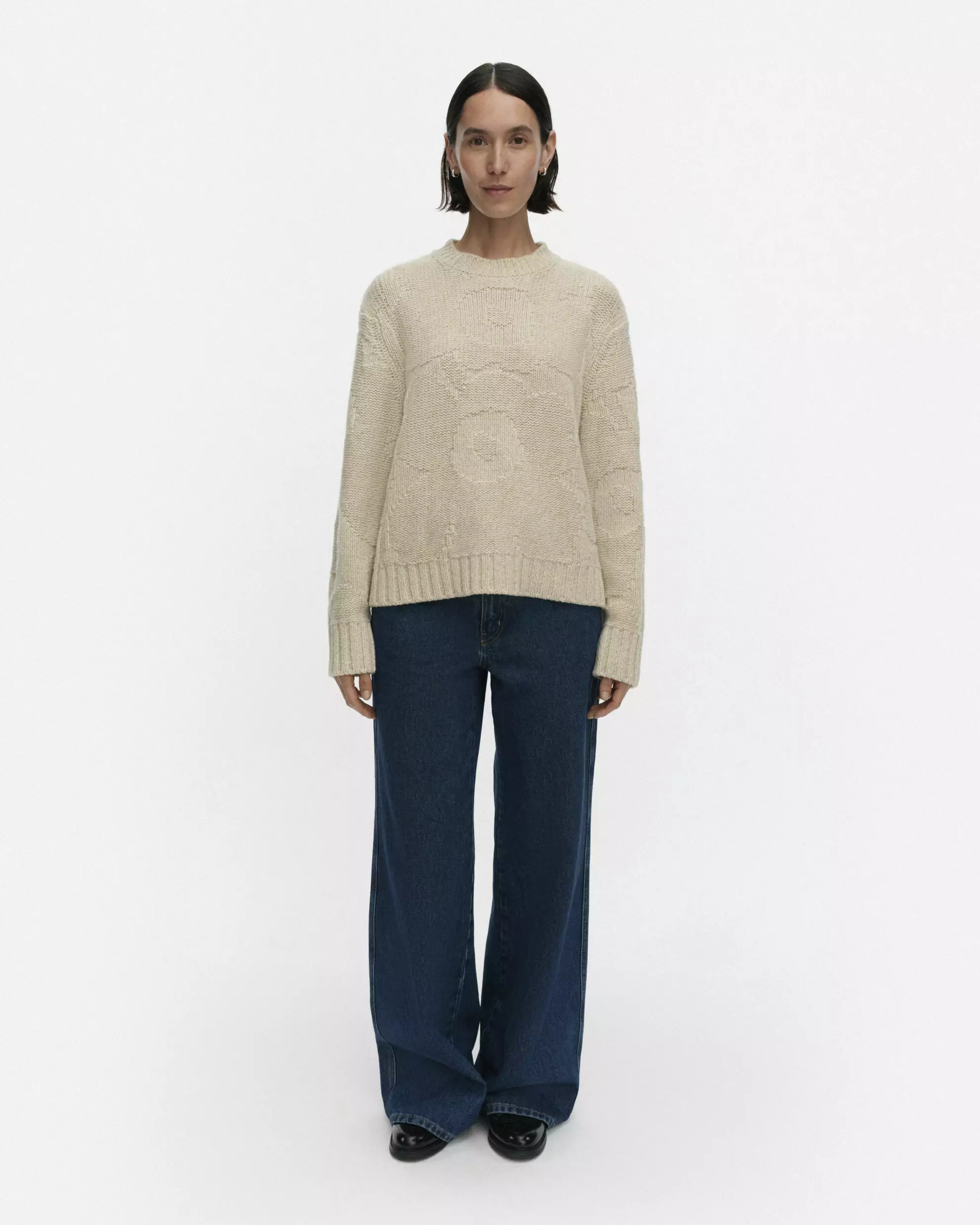 Tuote: Marimekko Vainu Unikko Neulepaita Avainsanat: Marimekko Vainu neulepaita, Unikko villaneulepaita, kierrätetty villa, meleerattu beige, rento neule, Maija Isola.