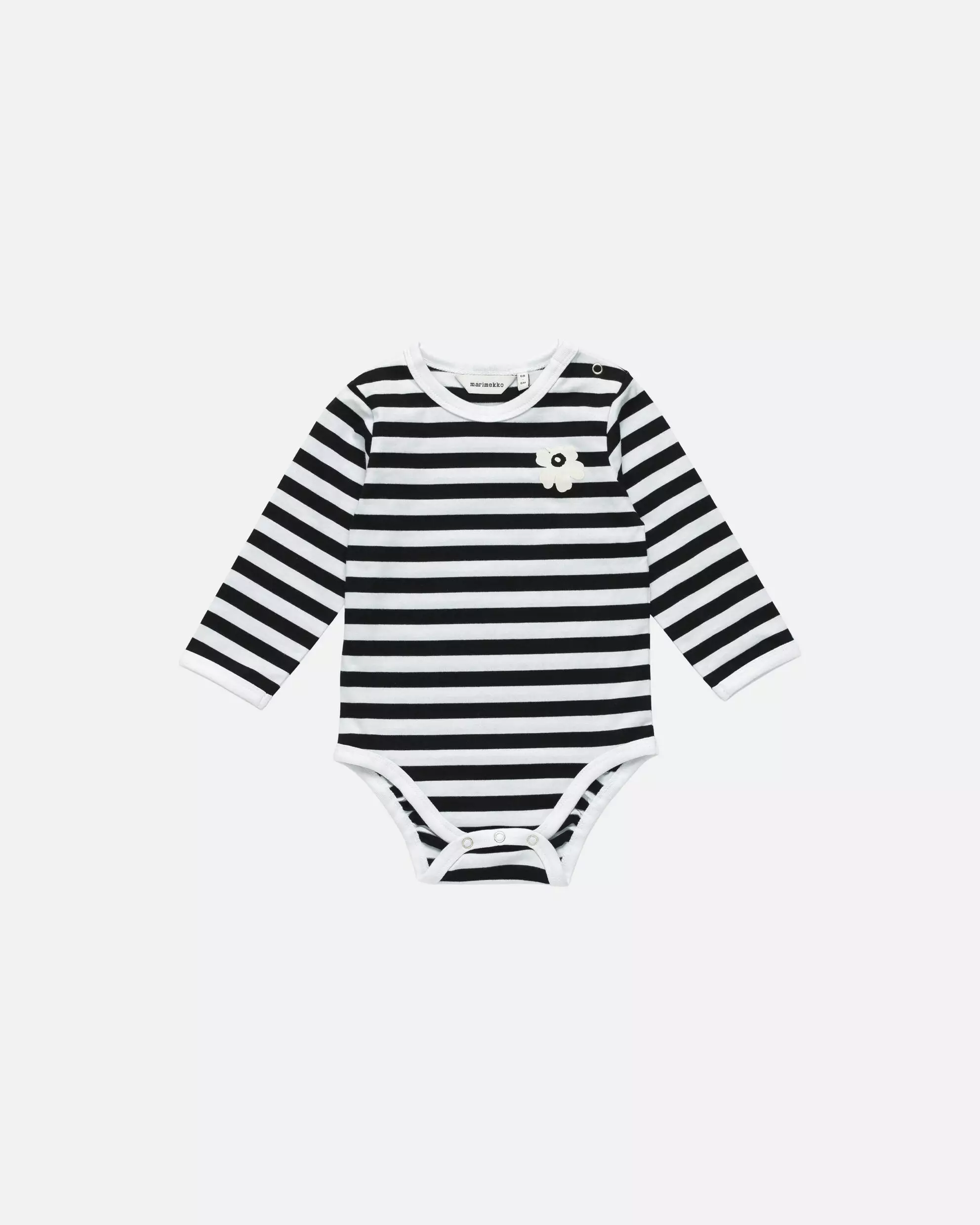 Tuote: Marimekko Vinde Tasaraita Unikko Trikoobody Avainsanat: Marimekko Vinde body, Tasaraita Unikko body, luomupuuvilla body, musta valkoinen raita, vauvan trikoobody, painonapit, Annika Rimala.