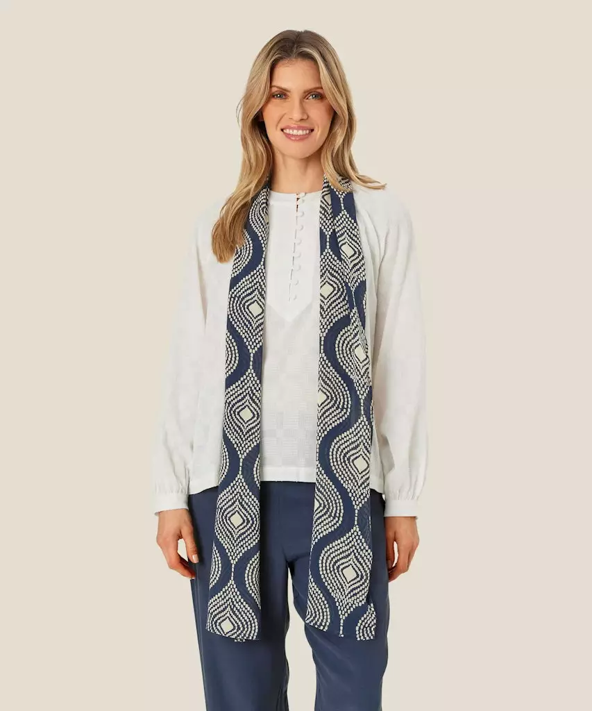 #masai #alonghuivi #huivi #viskoosihuivi #kuosillinenhuivi #taiteellinenprintti #moodindigo #sininen #valkoinen #monipuolinenasuste #tyylinvaihtaja #fscmiksa #kestävämuoti #asusteet #kaulahuivi #hartiahuivi