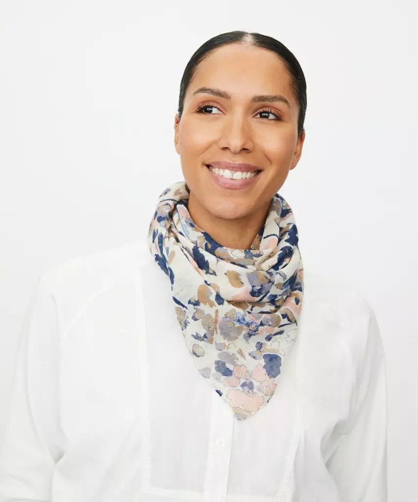 Harmoninen kukkakuosi: Sinisen, pinkin ja hiekan sävyt sointuvat upeasti yhteen ja tekevät huivista helpon yhdisteltävän monenlaisten yläosien kanssa.