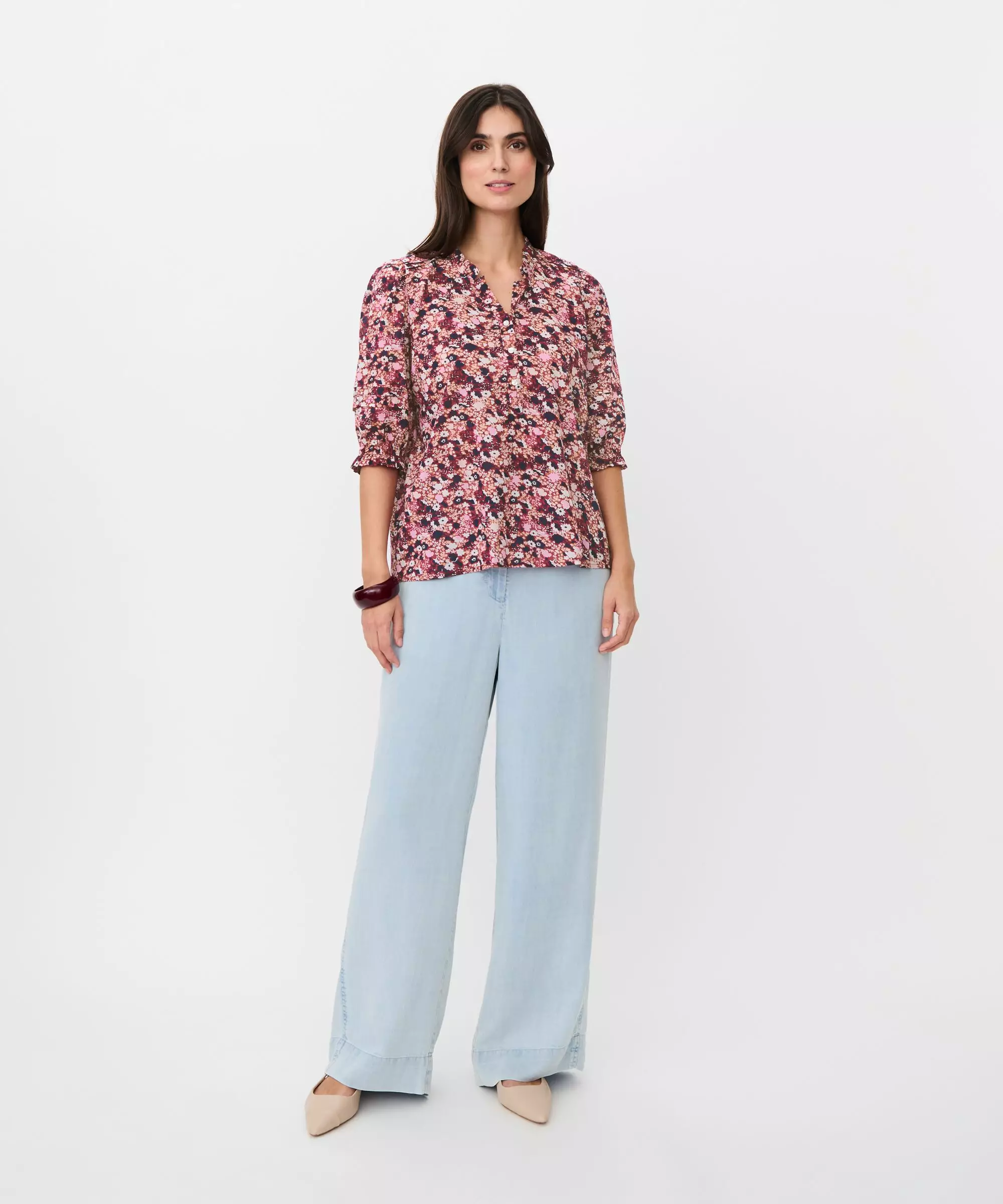 Mabrenitha-puserossa yhdistyvät klassinen suora leikkaus ja herkät, naiselliset yksityiskohdat. Pääntiessä on siro halkio ja nappilista, joita kehystävät kauniit röyhelöt. Samat röyhelöyksityiskohdat toistuvat hihansuissa, tuoden kokonaisuuteen pehmeyttä ja juhlavuutta. Kevyt puuvillakangas laskeutuu kauniisti, tehden puserosta sekä mukavan että huolitellun asun osan.