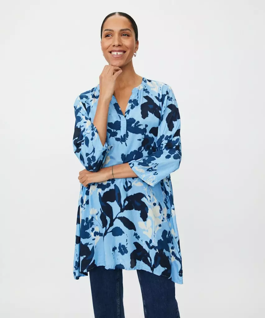 MAGALI-tunika on täydellinen valinta sinulle, joka arvostat helppokäyttöisyyttä tyylistä tinkimättä. Pääntien sirot halkiot tuovat yläosaan keveyttä, ja 3/4-pituiset hihat tekevät tunikasta monikäyttöisen eri vuodenaikoihin. Tunikan eloisa kukkakuosi on saanut inspiraationsa klassisista sinisen sävyistä, jotka on helppo yhdistää vaatekaapin muihin suosikkeihin.
