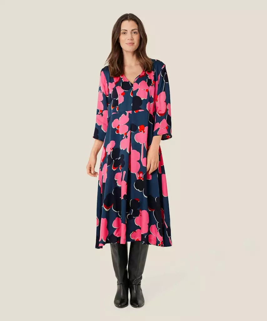 Jos rakastat kauniita kuvioita, niin tämän mekon hento kukkakuvio saa sydämesi sykkimään. Mekossa on hieman istuva leikkaus ja takana on kuminauha vyötärö, joka korostaa vyötäröä entisestään. Mekossa on V-pääntie ja leikkaus rinnan alla. Pehmeästä viskoosista valmistettu naisellinen mekko, jonka rakenteellinen kangas tekee siitä myös miellyttävän käyttää.