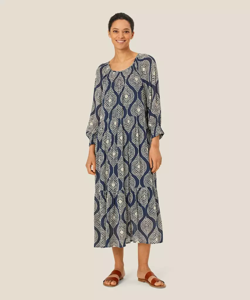 #masai #nazario #mekko #viskoosimekko #kuosillinen #käsinmaalattu #venepääntie #smokkihihat #alinjainen #kaksiosainenhelma #moodindigo #sininen #valkoinen #ajaton #tyylikäs #fscmiksa #kestävämuoti #vaivaton #naisellinen #printtimekko