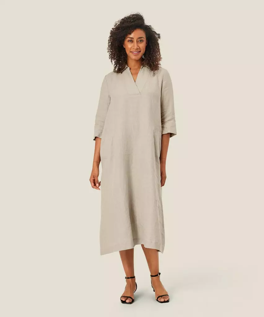 Tämä yksivärinen Masai Nikeeta -pellavamekko on täydellinen valinta ajattomaan ja mukavaan tyyliin. Mekossa on yksinkertainen ilme, paitakaulus ja syvä V-pääntie, kun taas klassinen suora leikkaus varmistaa, että mekko laskeutuu pehmeästi ja mukavasti vartalolle. Huomaa huomaamattomat sivutaskut, jotka ovat täydellisiä käsien sujauttamiseen. Käytä mekkoa sellaisenaan tai lisää siihen raikas väripilkku huivilla.