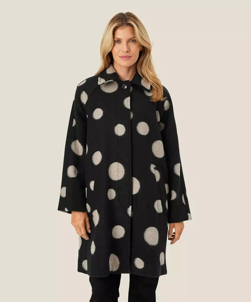 Pallokuosi on olennainen osa Masain kauniita printtejä – yksinkertainen ja viehättävä. Tämän takin suuret pallot toimivat suojana talven viileitä tuulia vastaan ja antavat samalla tyylikkään lisäsilauksen. Takki on valmistettu 50 % villasta ja siinä on vuori. Huomioi myös tyylikäs nappiyksityiskohta pääntiellä sekä sivutaskut. Täydellinen takki tyylikkääseen siirtymään vuodenaikojen välillä.