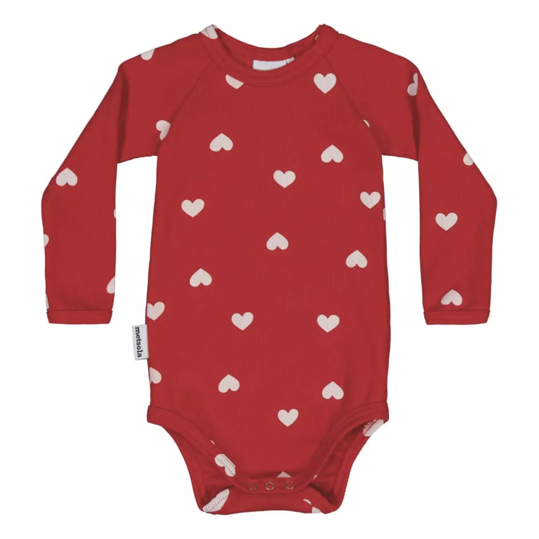 Tuote: Metsola Heart Song Rib Body Pitkähihainen Avainsanat: Metsola Heart Song body, rib body pitkähihainen, luomupuuvillabody, Poppy punainen body, vauvan juhlavaatteet, vauvan nepparibody.