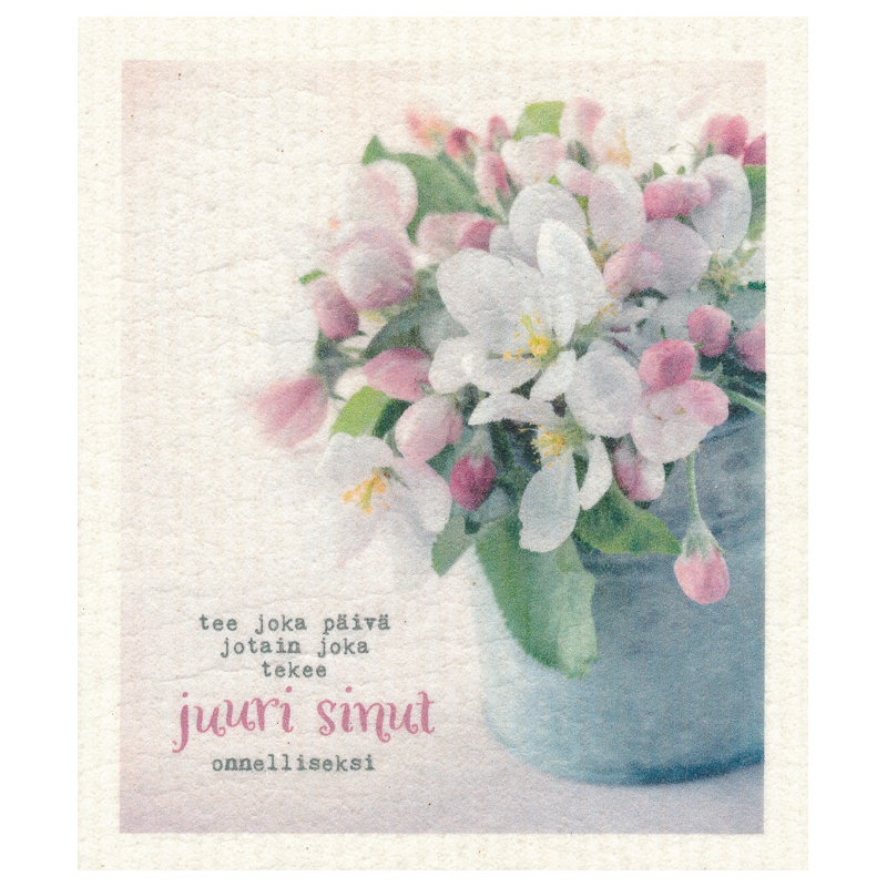 Valokuvauksellinen kauneus: Annemari Westin herkkä kuvitus tekee tästä rätistä pienen sisustuselementin, joka ilahduttaa silmää tiskialtaan reunalla.