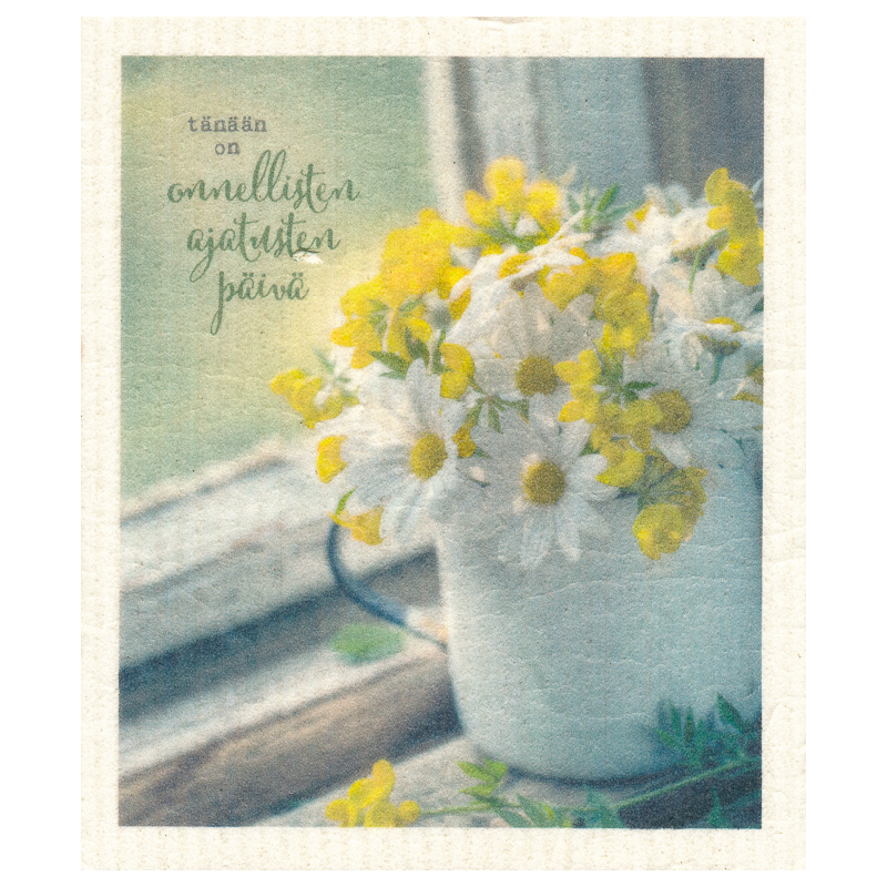 Tuo ripaus aurinkoa ja positiivisuutta siivoushetkiin MORE JOY -sarjan Onnellisten ajatusten päivä -tiskirätillä. Tämän liinan ihana keltainen väri ja herkät päivänkakkarat muistuttavat tärkeästä asiasta: "Tänään on onnellisten ajatusten päivä." Se on täydellinen arjen piristäjä, joka saa siivouksen sujumaan leikiten ja hyvällä mielellä.