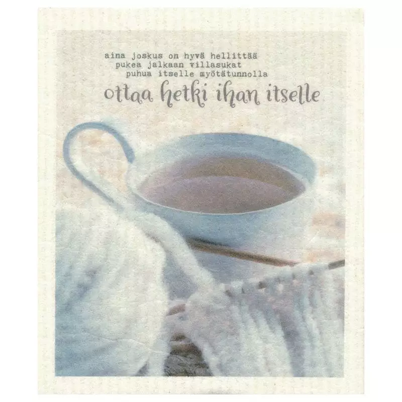 Tämä tiskirätti tuo keittiöösi pienen pysähdyksen hetken ja muistuttaa sinua siitä, että itsestä huolehtiminen on tärkeää.