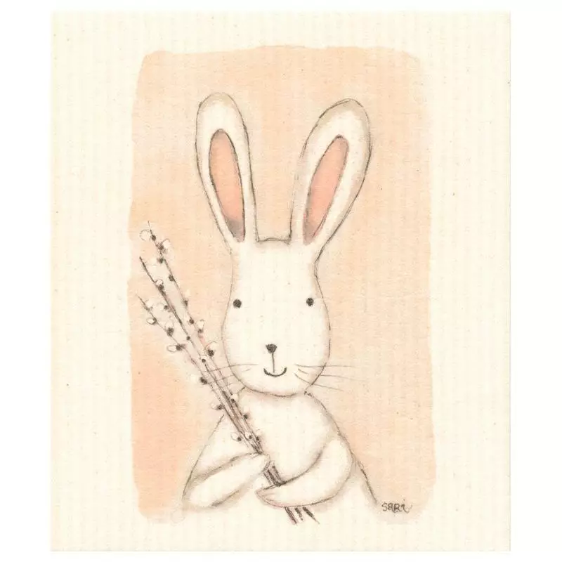 Sari’s Artworkin hurmaava kuvitus: Suloinen pupu pajunkissojen keskellä tuo välittömästi hyvää mieltä tiskialtaan reunalle. Se on pieni taideteos, joka piristää keittiön ilmettä.