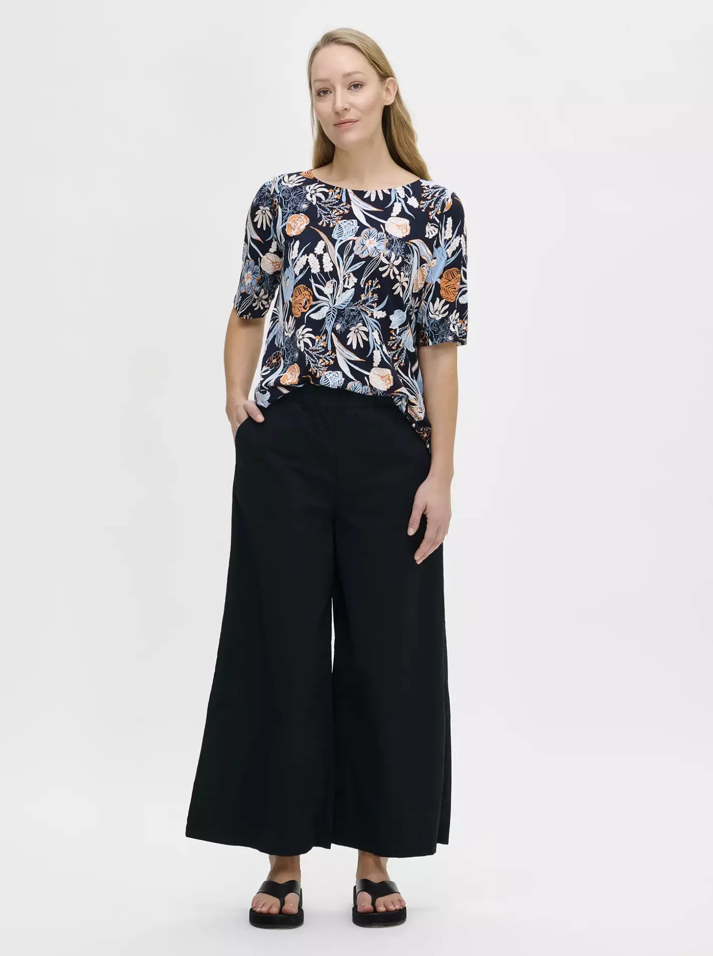 Tämä Nanson Floristi-pusero tuo väriä ja iloa pukeutumiseesi kauniilla kukkakuvioinnillaan tummansinisellä pohjalla. Väljässä puserossa on tyylikäs kantilla viimeistelty ovaali pääntie ja käytännölliset puolipitkät hihat. Helmassa olevat korkeammat sivuhalkiot lisäävät puseron rentoutta ja liikkuvuutta. Pusero on valmistettu laadukkaasta ja miellyttävän tuntuisesta LENZING™ ECOVERO™ -viskoosi-elastaani-neuloksesta, joka on sähköistymätöntä ja helppohoitoista.