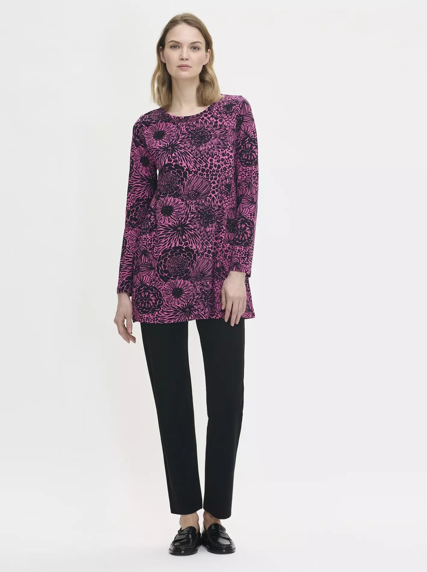 Tuo asuusi kukkaloistoa tällä Nanson kukkakuvioisella Huvi-trikootunikalla. Sen pinkki ja musta väritys on rohkea ja tyylikäs valinta, joka sopii moneen tilaisuuteen. Tunikassa on A-linjainen malli, tereellä viimeistelty pyöreä pääntie, kätevät sivutaskut ja täyspitkät hihat. Se on valmistettu pehmeästä ja miellyttävästä puuvilla-elastaanista, mikä tekee siitä arjen luottovaatteen.