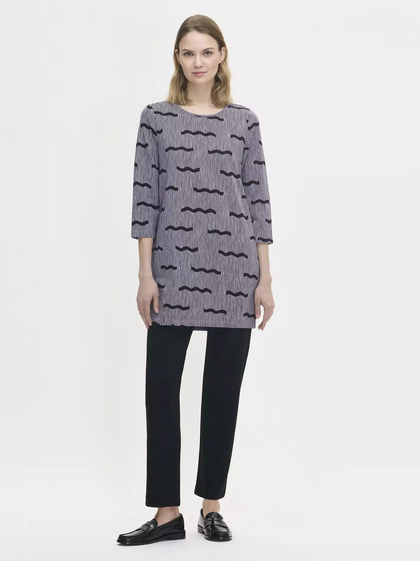 Design: Naisten kuosillinen tunika. Rentolinjainen malli, tereellä viimeistelty pyöreä pääntie, 3/4-pituiset hihat, pyöristetty helma muotolaskoksilla (tulppaanimainen muoto). Sivutaskut.
