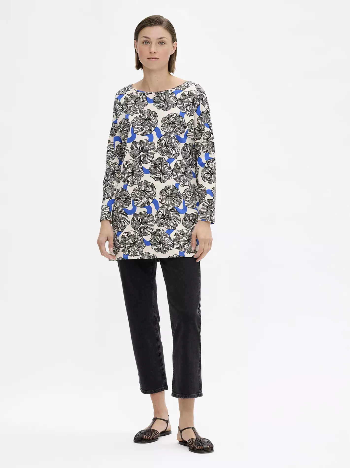 Malli on 180 cm pitkä ja hänellä on päällään koko S/36. Tunika on suoralinjainen, joten se istuu kauniisti omassa koossasi tarjoten sopivasti väljyyttä.