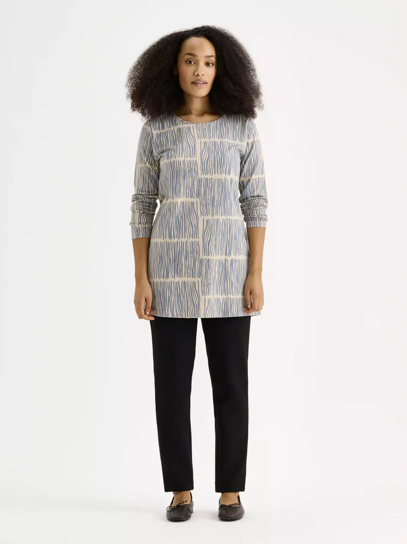 Ruoko-tunika on mukavan arkipukeutumisen todellinen kulmakivi. Sen hienostunut sinisen ja beigen sävyinen kuosi tuo asuun pehmeyttä ja valoa, ollen samalla erittäin armollinen ja helppohoitoinen. Pyöreä pääntie on viimeistelty kestävyyttä ja ryhtiä tuovalla tereellä, joka antaa tunikalle huolitellun ilmeen.