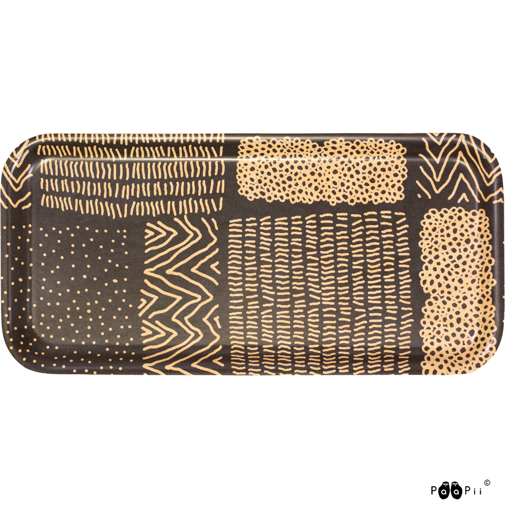 PaaPiin kotimainen tarjotin Sarka-kuosilla. Kauniskuosinen, puinen tarjotin on valmistettu kotimaisesta koivuviilusta Suomessa. Tarjottimella on ympäristöystävällinen melamiinipinta, joka kestää kuumuutta ja hankausta. PaaPii-tarjotin on näyttävä yksityiskohta sisustuksessa sekä erinomainen lahjaidea!