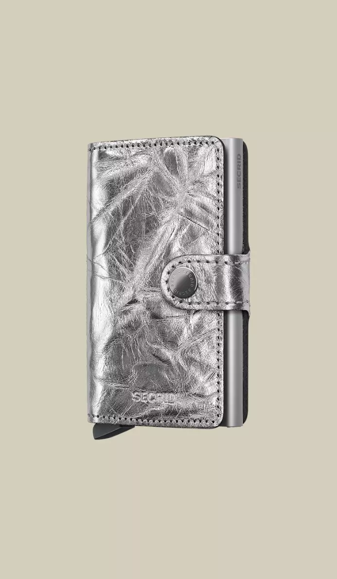 Tuote: SECRID Miniwallet Crunch Lompakko Avainsanat: SECRID Miniwallet, Crunch Metallic, RFID lompakko, hopea, metallinhohtoinen nahka, alumiinikotelo, turvallinen lompakko.