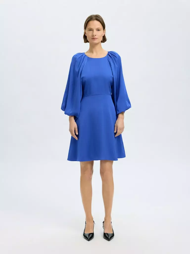 #selectedfemme #laurinamekko #satiinimekko #minimekko #avoin selkä #ballonkihihat #juhlamekko #kirkkaansininen #naistenvaatteet #elegantti
