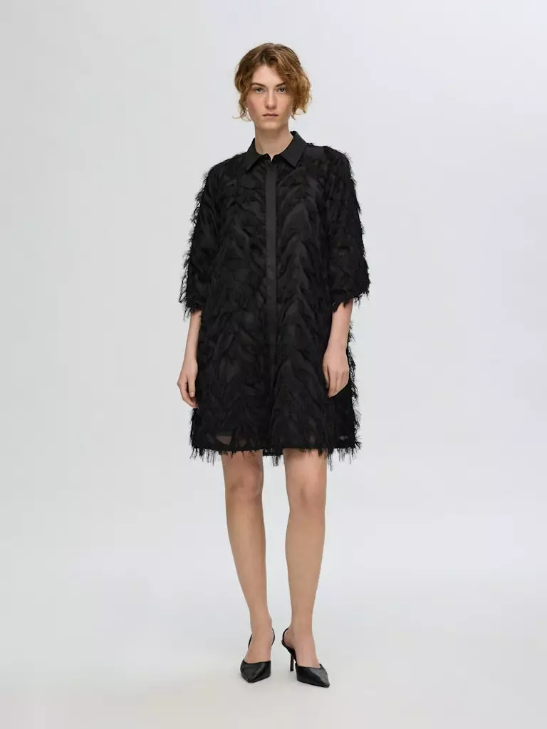 Lisää vaatekaappiisi ripaus glamouria tällä teksturoidulla vuorellisella paitamekolla. Se on valmistettu kiiltävästä satiinista ja siinä on höyhenenkaltaisia yksityiskohtia, ja viehättävä minipituus tekee siitä täydellisen valinnan. Yhdistä mekko korkokenkien ja kultaisten korvakorujen kanssa. Mukana irto vyö.